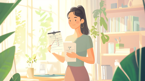 An uplifting and motivating scene showing a woman confidently taking small steps towards a better lifestyle. She holds a checklist or planner with a few crossed-off goals, while her environment subtly transforms from chaotic to organized. Around her are symbols of positive habits like a yoga mat, a glass of water, and books, creating a visual metaphor of progress. The setting is bright and inviting, filled with soft, warm colors to evoke a sense of achievement and positivity. High resolution, 1920x1080 pixels, --ar 16:9