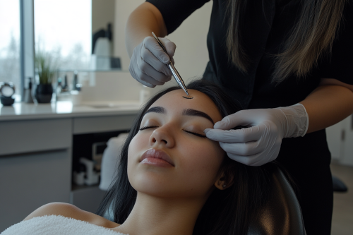 A young woman is reclining comfortably in a modern, well-lit beauty salon, while a professional technician carefully applies permanent eyebrow makeup with precision tools. The woman has relaxed, closed eyes, and her facial expression is calm and serene. The technician is focused, wearing gloves, and using a small handheld device to shape the brows. The background shows a clean, minimalist salon space with soft lighting, elegant mirrors, and professional equipment. The atmosphere is professional yet soothing, with a focus on beauty, precision, and self-care --ar 3:2