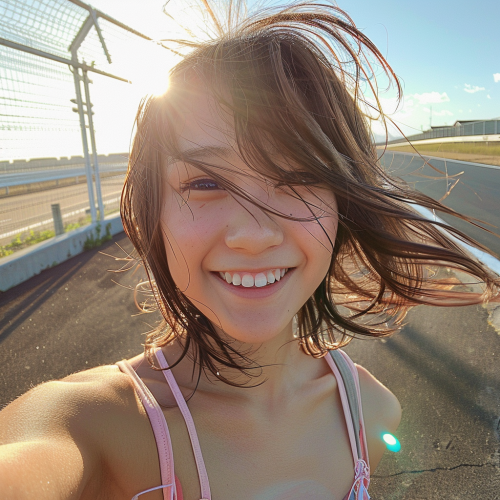 At the entrance to the racetrack in mid-summer, a young Japanese woman in her teens looks a little embarrassed and pleased with her pretty smile. Sleeveless, medium hair, brown hair color. She is bathed in sunlight from the front and blown by a gentle breeze. High-angle selfie photo. --v 6.0