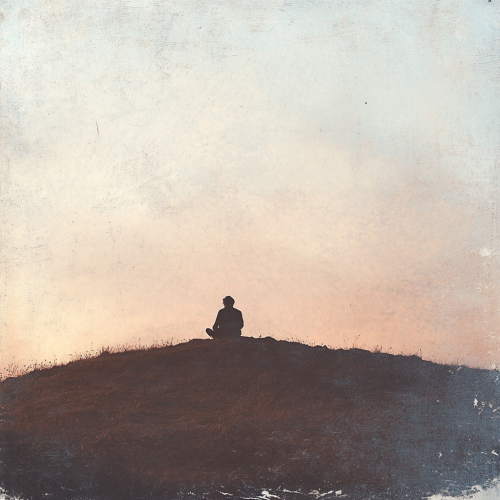 An album cover capturing the essence of solitude and self-reflection. Picture a lone figure sitting on a quiet hill, overlooking a vast landscape at sunset, with soft golden light fading into dusk. Surround the figure with a peaceful, minimalist environment, using muted tones like soft greys and blues. The title 'By Myself' should be subtly integrated into the natural surroundings or sky.