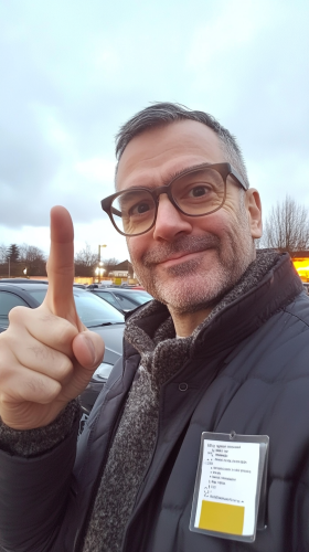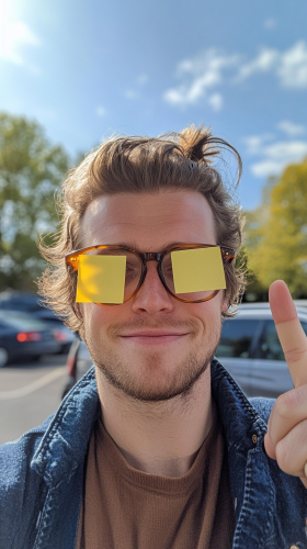 Selfie photo of a British man, wearing eyeglasses with big post-it notes on the eye glasses, pointing finger up, behind him is a car front view, low angle camera, two big post it notes sticked on his eye glasses, looking at the camera, smiling, pointing up with his finger, parking lot in Manchester in the background, Natural lights, Posted on Snapchat Stories, Spring time, Taken with Android phone. photo structure half empty, spring time sky. --ar 9:16