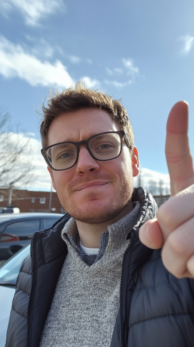 Selfie photo of a British man pointing finger up, behind him is a car front view, low angle camera, he is wearing eye glasses and there are two sticky notes on his eye glasses, looking at the camera, smiling, pointing up with his finger, parking lot in Manchester in the background, Natural lights, Posted on Snapchat Stories, Spring time, Taken with Android phone. photo structure half empty, sky. --ar 9:16