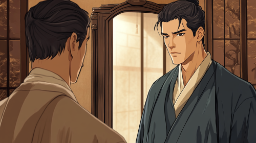 Claro, aquí tienes la traducción al inglés: Traditional Chinese man looking at himself in the mirror, with a doubtful expression. anime-style, in a --ar 16:9 --v 6.1
