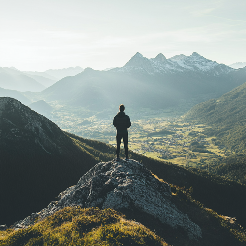 A person standing confidently on a mountain peak after a hike, looking over a beautiful landscape, their expression serene, representing the reduction of anxiety and mental clarity from exercise.