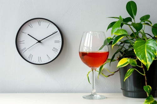 An elegant clock with a glass of wine next to it, symbolizing time to eliminate alcohol, minimalist style, clean and sharp details, bright background --v 6.0 --style raw --ar 3:2