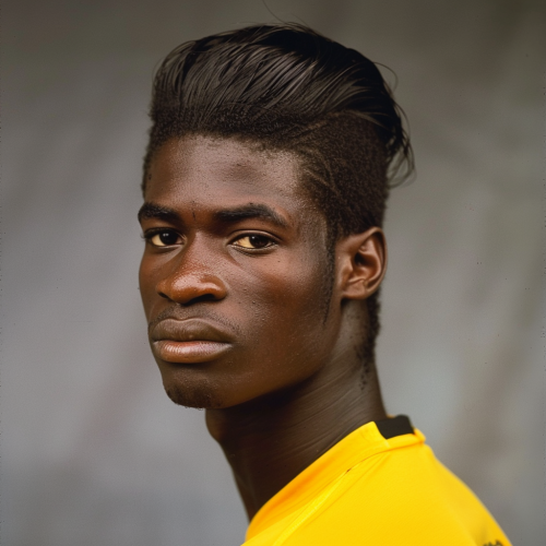 football manager cut out faces - football neck cut professional picture - plain neck picture - facing the camera - eighteen years old black english nigerian football player, strong neck, 80's haircut smoothen wet long black hair mullet, long strong neck, high cheekbones, yellow CLEAR eyes --v 6.0