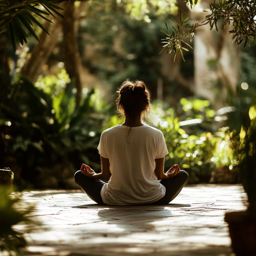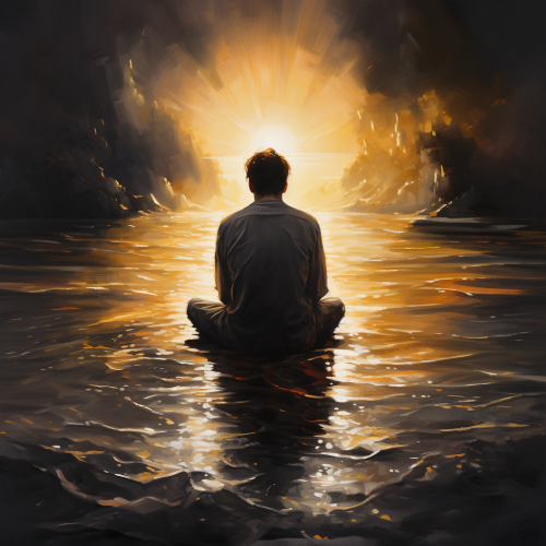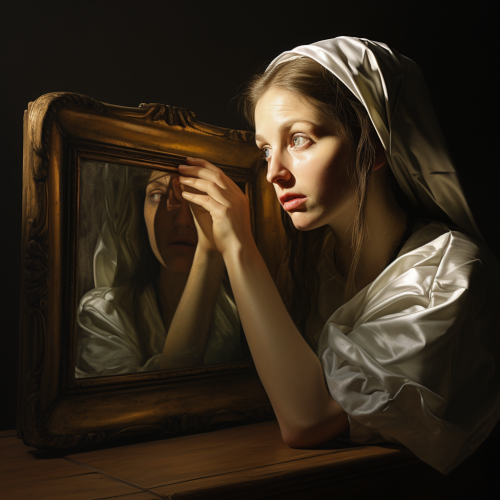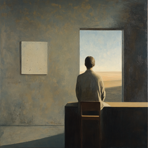 A contemplative and intimate scene focusing on the theme of self-reflection and individuality. The setting could be a solitary environment such as a quiet, dimly lit room with a single figure in front of a mirror, or a serene, open landscape where one person is alone, gazing into the distance. The central focus is on the figure engaged in a moment of introspection, perhaps sitting quietly, writing in a journal, or simply standing alone with a thoughtful expression. The background features soft, muted colors like gentle grays, warm browns, and subtle blues to emphasize solitude and self-discovery. Subtle details like a single light source casting gentle shadows or a minimalist setting add to the atmosphere of personal reflection. The overall mood is introspective and serene, capturing the essence of being alone with oneself and exploring one’s own thoughts and feelings.