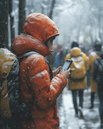 A public setting like a park or café, where several people are absorbed in their own world, looking down or scrolling through their phones, reflecting self-doubt and introspection. In the foreground, one person stands confidently, appearing calm and at peace despite being apart from the group. The atmosphere shows a contrast between self-acceptance and the inner struggles many people face, representing the quote 'Don't worry if people don't like you. Most people are struggling to like themselves. Dugald steward walker art --ar 4:5 --s 750