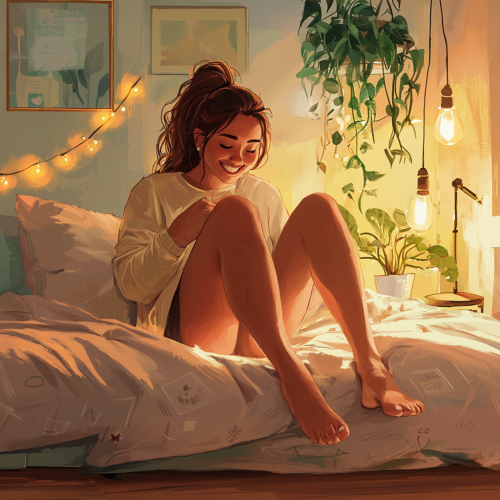 A relaxing bedroom scene where someone is sitting on their bed, smiling while looking at their healthy, clean toenails. The setting is cozy and warm, emphasizing self-care and satisfaction. --q 2 --v 6.1