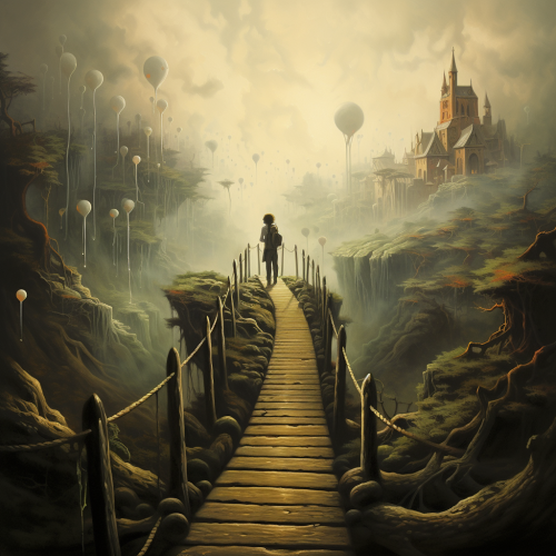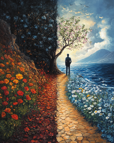 A person stands at the edge of a river. On one side of the river is a rocky, barren landscape representing past mistakes. The person is stepping onto a bridge leading to the other side, where the landscape is lush and green, symbolizing a fresh start. Behind them, faint footprints in the dirt show their old path, but they are now looking ahead to the new, vibrant land. --ar 4:5 --s 750