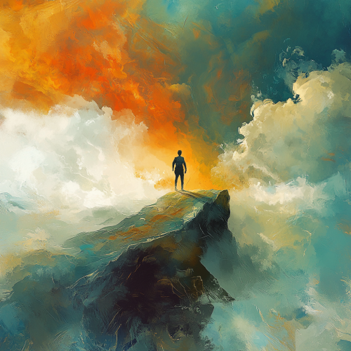 A determined and empowering scene that illustrates resilience and self-reliance. The setting could be a person navigating a challenging or rugged landscape, such as climbing a steep mountain, crossing a turbulent river, or pushing through a storm. The figure is depicted with a look of confidence and resolve, moving forward despite obstacles. The background features dramatic, yet hopeful elements like breaking clouds, a rising sun, or a clear path emerging from the darkness. The color palette includes bold, uplifting tones like strong blues, vibrant oranges, and fresh greens to emphasize strength and perseverance. Subtle details such as footprints in the sand or a guiding light add to the sense of overcoming challenges. The overall mood is inspiring and determined, capturing the essence of managing through difficulties with confidence