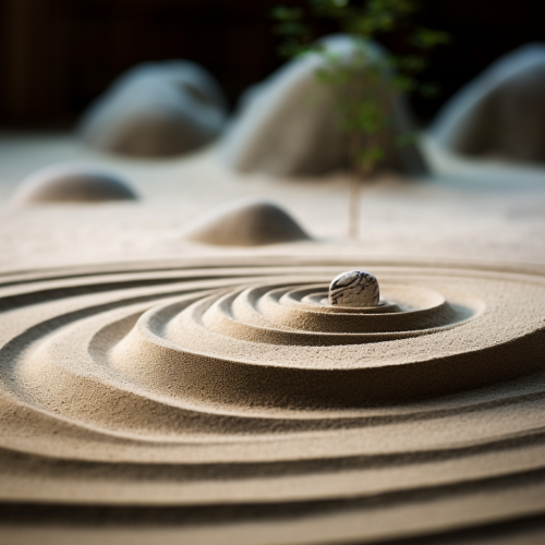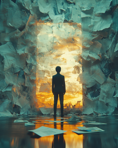 A person sitting at a desk with a stressful expression, surrounded by cluttered papers and deadlines, the background subtly transforming into a peaceful outdoor setting, representing the contrast between stress and relaxation.