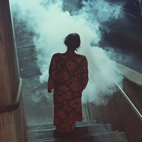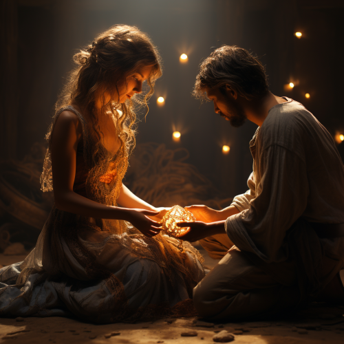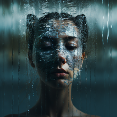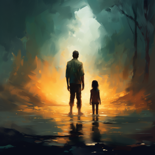 man from behind encourages woman, playing children, in the style of surreal and dreamlike, digital painting, moody and evocative color palettes, light teal and amber, melancholic self-portraits, 8k resolution, serene solitude --v 5.2