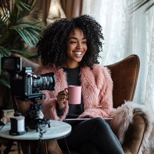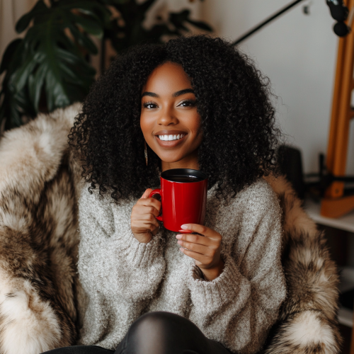 happy young black woman with curly hair holding red coffee mug recording a youtube video in fur chair in beautiful home office person facing backward not showing face