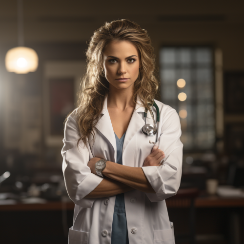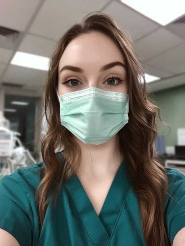 A photo of a white nurse face and shoulders taken in front, with no makeup on her slightly smiling mouth. The background is hospital setting. It's an iPhone selfie, taken at at desk. A closeup shot of a woman wearing scrubs with loose waves hairstyle.and a surgical mask on --ar 3:4
