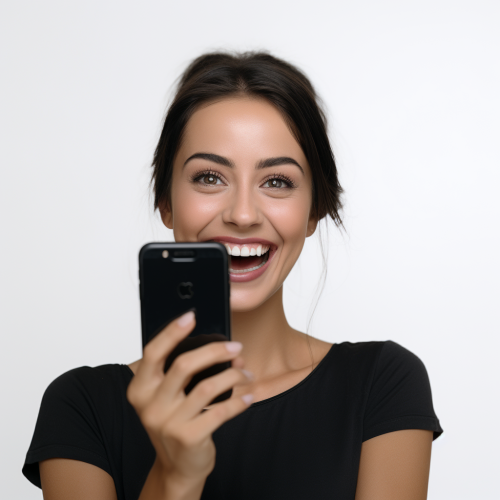 A realistic woman smiles with black hair holds a mobile phone in front of her face and takes a selfie, and the mobile phone shows her extremely beautiful picture on the mobile screen in front of blank white background unity, and strength, Photography, DSLR Canon EOS 5D Mark IV with 24 - 70mm lens