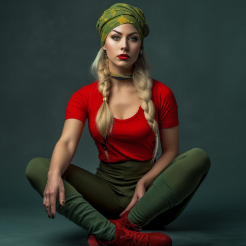 stunning blonde with braided hair wearing green leggins and a combat top. Wearing a red beret, Lithe, stretch pose, comic book style --s 250 --v 5.1