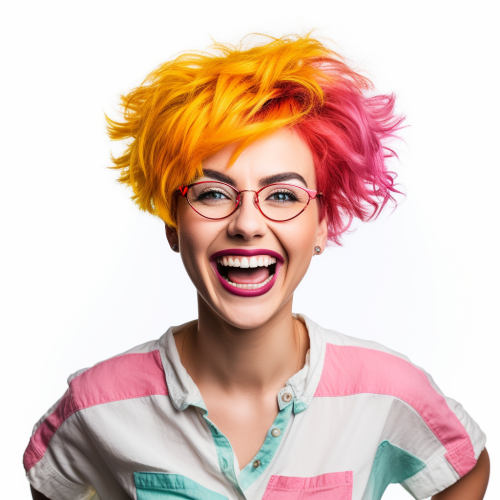 female motivational speak wearing bright red and yellow with pink hair on white background