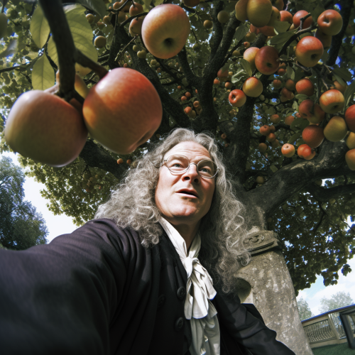 /mid angle realistic GoPro selfie of Sir Isaac Newton watching an apple fall under an apple tree --ar 1:1 --style raw
