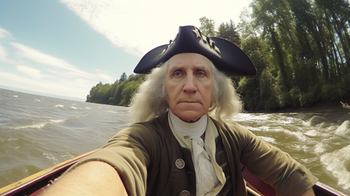 /Realistic GoPro selfie of George Washington crossing the Rubicon river on a boat --ar 16:9 --style raw