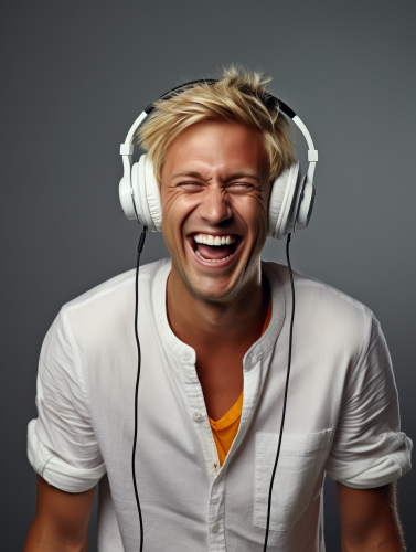 Hyper realistic happy man with, smile, left hand up, Sennheiser hd 25 headphones, blonde straight short hair, light grey background, white shirt, soft lighting, analog photography, sharp focus, Kodak Ektar 100, light yellow, --v 5.2 --ar 3:4
