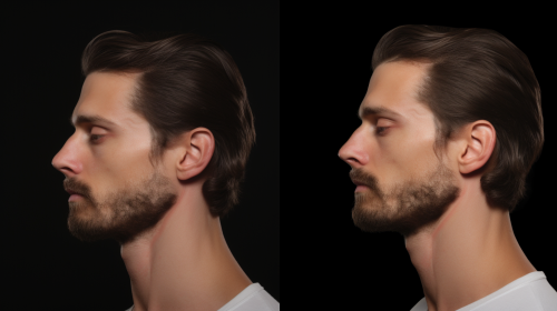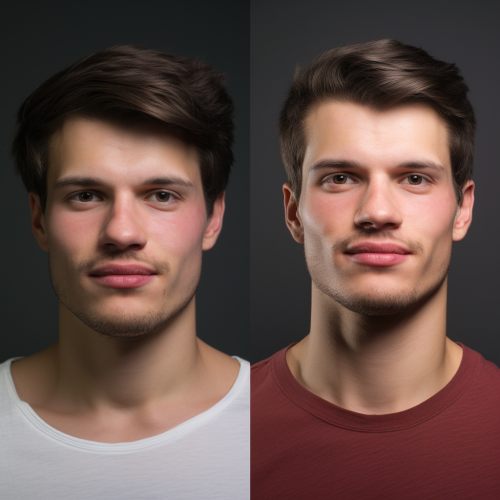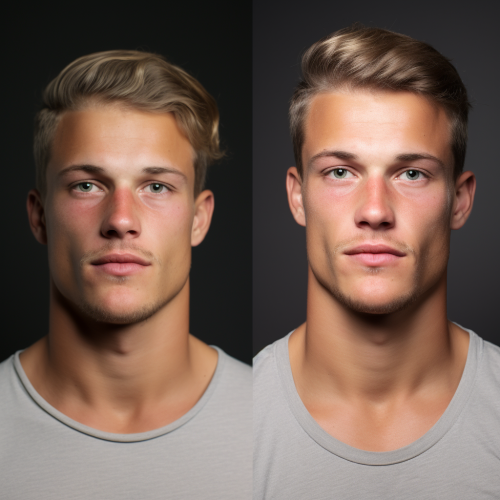 male model with before and after picture showing transformation of his jaw after excersise, before picture showing smaller jaw and after picture showing more masculine jaw transformation, realistic --ar 16:9