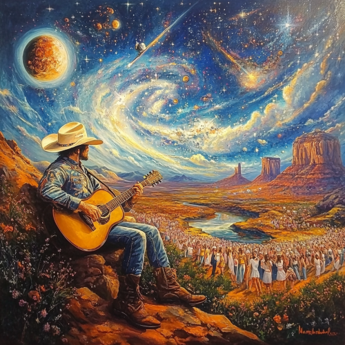 crea la imagen de un paisaje donde se puede ver un vaquero galactico dando un concierto en la via lactea de otro lado estan todas las chicas que lo ven y aplauden su acto