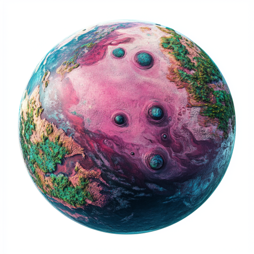 A new magenta planet as seen from space, blue oveans, green forests, a shallow magenta sea with thousands of floating darker magenta islands, white backround
