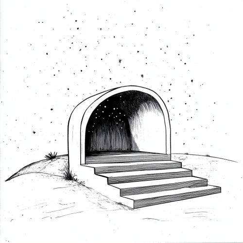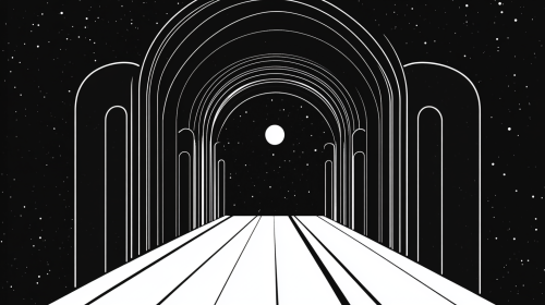 A black and white vector design of an archway with straight lines, a single point light at the end illuminating everything in front of it, symmetrical, space odyssey, cinematic --ar 16:9
