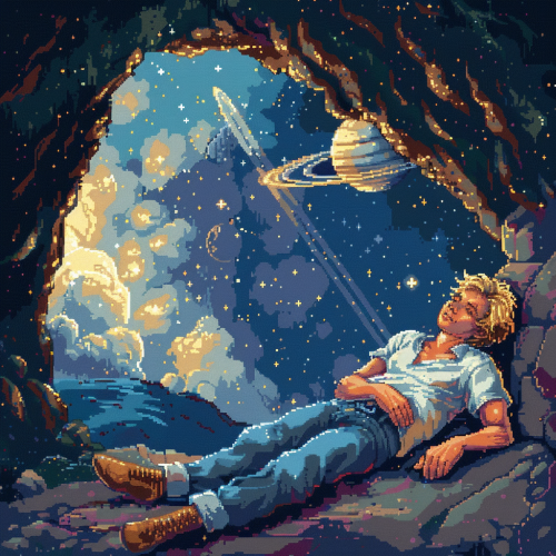 Create a pixel art GIF featuring a young, muscular blond man, in a Lofi Girl-like scene, asleep in a softly illuminated cave. His face is not visible, adding an element of mystery. As he dreams, his imagination brings forth a vast, transcendent universe, where a starry sky filled with constellations and a majestic Saturn with its rings come to life. His dreams paint a contemplative, metaphysical landscape, with living constellations floating above him, offering a celestial paradise. The scene should have a surreal, almost painterly style, blending the calm serenity of his sleep with the immense beauty of the cosmos, where dreams and reality intertwine. The atmosphere is peaceful, symbolic, and profoundly introspective, as if the stars themselves are an extension of his consciousness. --s 250 --v 6.0