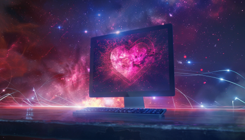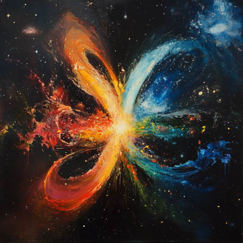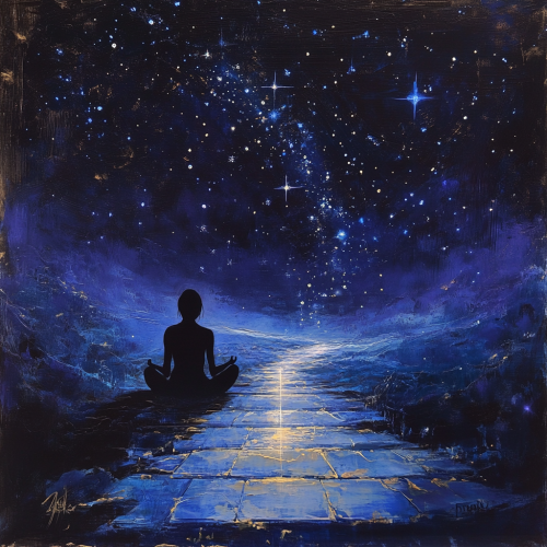 Create an abstract, harmonious scene that illustrates a deep connection with the universe. In the foreground, a person is sitting in a meditative pose beneath a vast, starry sky. The stars form glowing constellations above, while a luminous pathway stretches from the person toward a distant, infinite horizon. The scene should evoke a sense of infinite possibilities and cosmic unity. Use calming colors like deep blues and purples, with soft, radiant light to create a peaceful and inspiring atmosphere.