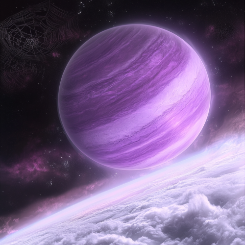 A new planet as seen from space, a purple gas giant, silver spider webs in the atmosphere, white backround, featureless, a purple fog planet, color pallatte is purple black violet