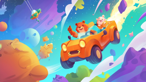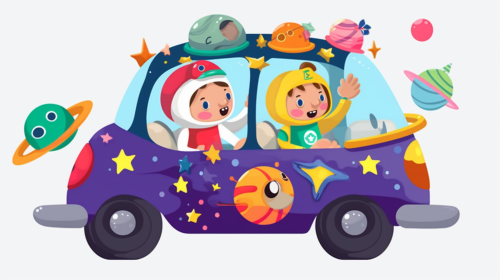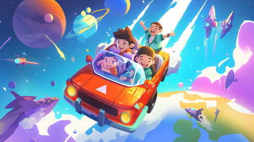 A colorful cartoon car with four characters inside, driving on the road in space, surrounded by planets and spaceships, with an adorable robot sitting at its helm, depicted as cute animated illustrations. The scene is designed to be cheerful and playful, suitable for children's animation or visual storytelling, featuring bright colors and exaggerated character designs. --ar 121:68 --s 50 --niji 6