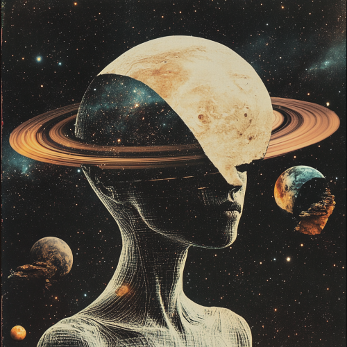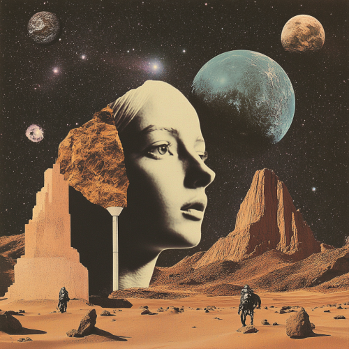 create a utopian collage, related to melodich techno music reminiscent of the word like a desert miss the rain, space, aliens, humanoids, with a backdrop of a starry universe in a minimalist