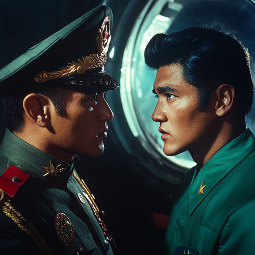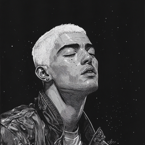 sketched portrait of a young adult Hispanic male with shaved bleach blonde hair, eyebrow slit, wearing a 90s short jacket and jumper inspired by the clothing from the Alien movie franchise, on a black background in the style of John Berkey illustrations, small dots of dull sci-fi light and stars in the background, dark space, black and white, --v 6.1