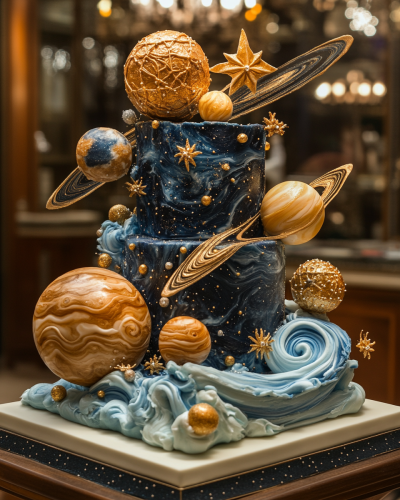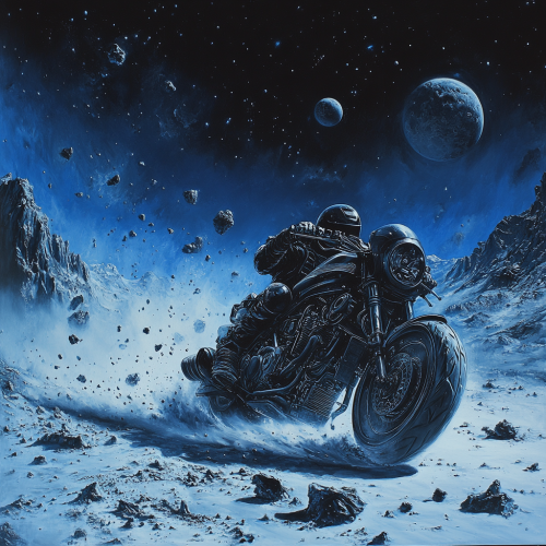 dark fantasy 80s a intergalactic futuristic motorcycle heavily armored speeding on it in deep space , surrounded by meteors and planets, a surrealistic painting with black outlines, from dark, dark fantasy, it has a dark blue gradient sky, there should be mountains of earth that turned into dust, hyper realistic - - v6.1