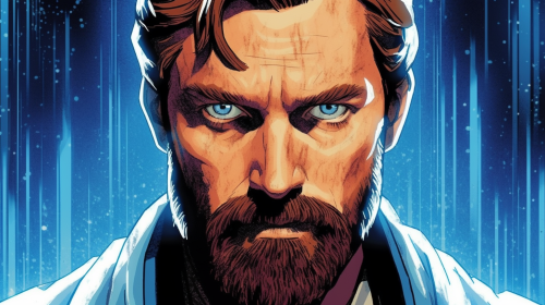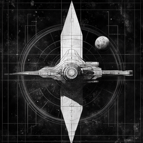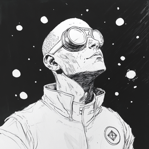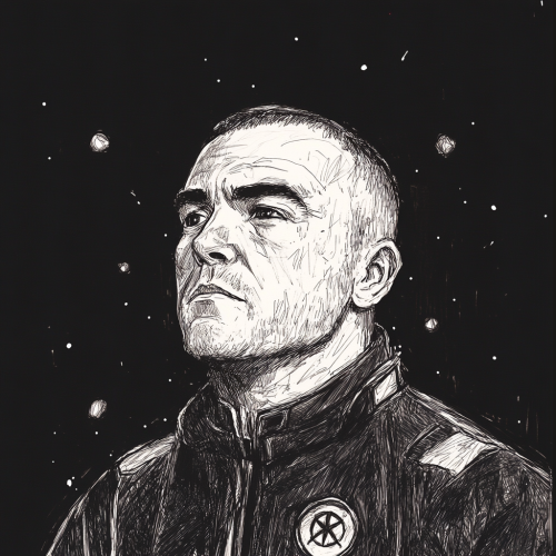 sketched portrait of an adult man with shaved messy slightly receding hair, wearing a 90s boiler suit with a meteor symbol logo on it, aged in his 30s, wearing a sci-fi pair of goggles in his head, clothing inspired by the clothing from the Alien movie franchise, sci-fi, on a black background in the style of John Berkey illustrations, small dots of dull sci-fi light and stars in the background, dark space, black and white, --v 6.1