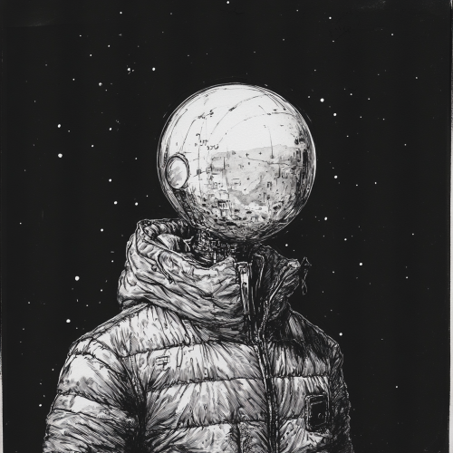 sketched portrait of robot with a glass sphere for a head, old, no face, broad and strong looking, metallic, wearing a 90s puffer jacket inspired by the clothing from the Alien movie franchise, on a black background in the style of John Berkey illustrations, small dots of dull sci-fi light and stars in the background, dark space, black and white, --v 6.1