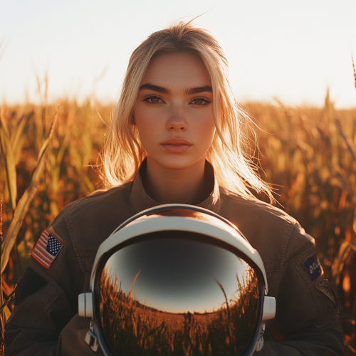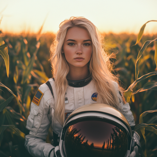 produce a fashion photograph with a grungy grimy chic full of flaws of a beautiful young blonde woman standing in a corn field in sunset wearing an astronauts uniform staring at the camera with the astronauts helmet in her arms shot on a Contax T2