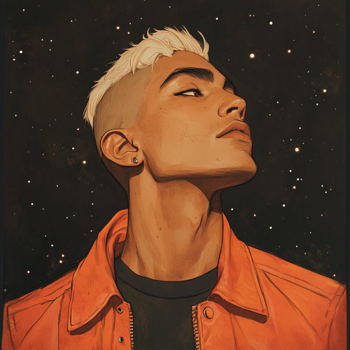 drawing of a young adult male with shaved bleach blonde hair, wearing a 90s short dark orange jacket and jumper inspired by the clothing from the Alien movie franchise, Chris Riddell art style, small dots of sci-fi light leaking in and stars in the background, dark gouache space background, HD, 4K, --niji 6