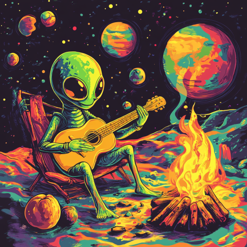 alien playing guitar by a campfire, the campfire and alien are floating through space, there is a planet in the background is a peach like the fruit. very bright very colourful very hippy, style of rocket power cartoon