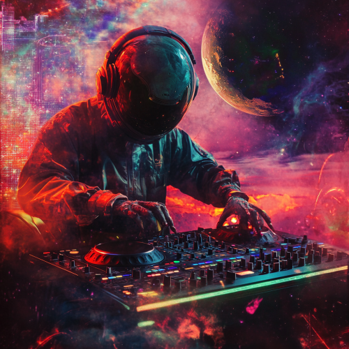 create an image for a cover of a dj doing Melodic Tech House and Melodic Techno & House music, then create a collage with aliens, space, sureallism, utupism