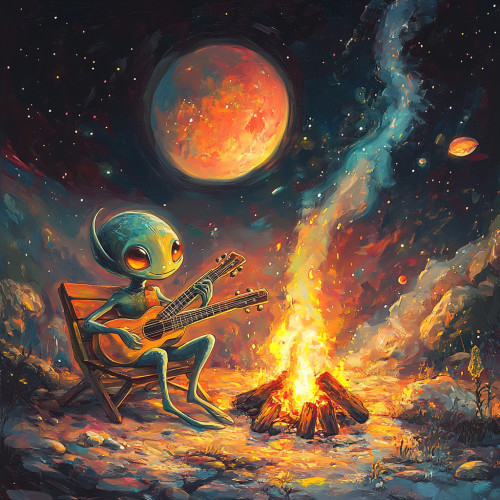 alien playing guitar by a campfire, the campfire and alien are floating through space, there is a planet in the background is a peach. style of Hayao miyazaki