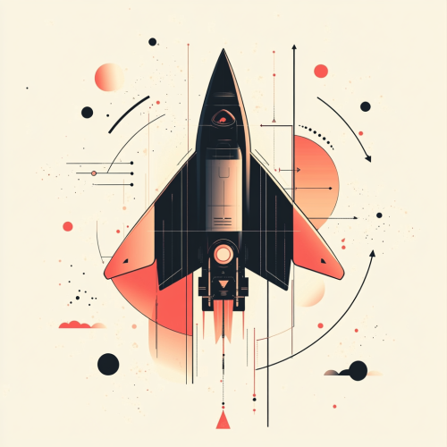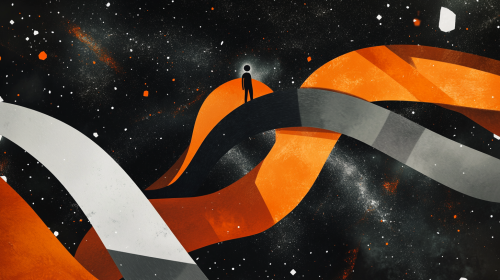 Abstract illustration of an interstellar journey, with orange and gray ribbons representing space travel against the backdrop of stars. The figure is depicted as being suspended in one ribbon, creating a sense of weightlessness amidst the vast cosmic expanse, in the style of John Holcroft for A24 Film. --ar 16:9