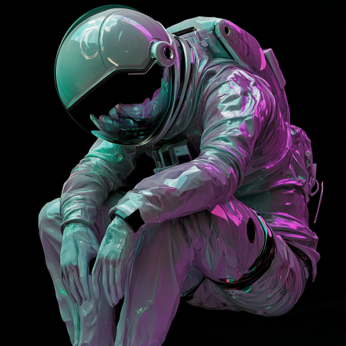 3d fluency design of an astronaut who is looking down in a saddening weary position, mint green and light violet colours, glass looking costume, black background