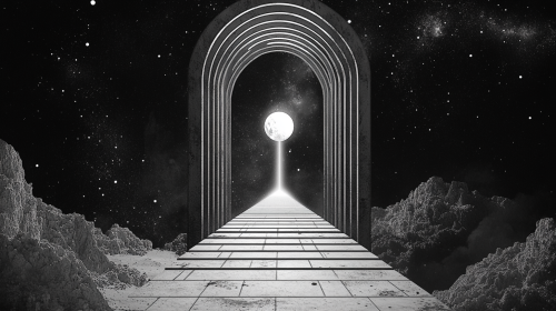 A black and white vector design of an archway with straight lines, a single point light at the end illuminating everything in front of it, symmetrical, cinematic, realisitic space themed --ar 16:9