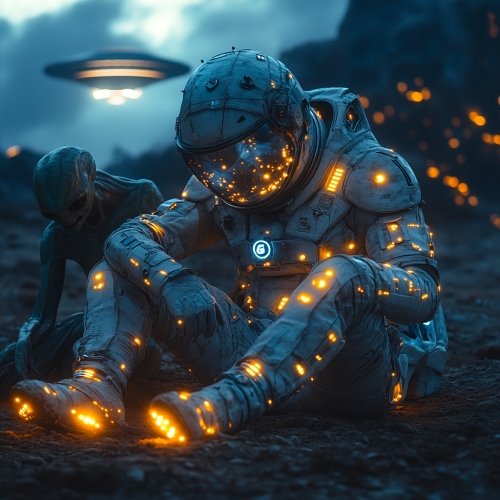 a depressed astronaut sitting in the dirt with glowing light blue lights all over the suit ONLY where there is buttons or connectors on the suit telling his story to a alien sitting next to him with a UFO in the background --v 6.1 --s 750 --style raw