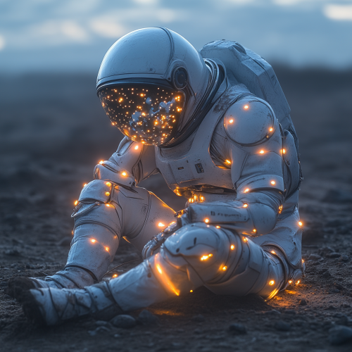 a depressed astronaut sitting in the dirt with glowing light blue lights all over the suit ONLY where there is buttons or connectors on the suit --v 6.1 --s 750 --style raw
