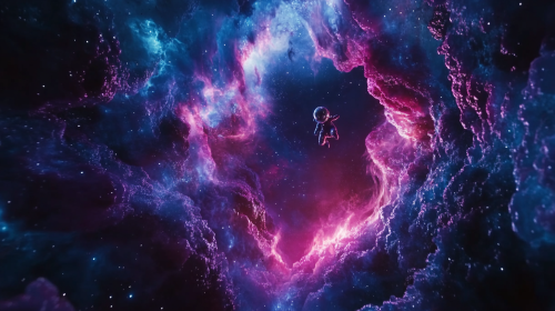 space background image with light effects , flickers of , cinematic, interstallar themed, there is wormhole at the bottom right of the screen where a jelly textured astronaut is climbing out of --ar 16:9