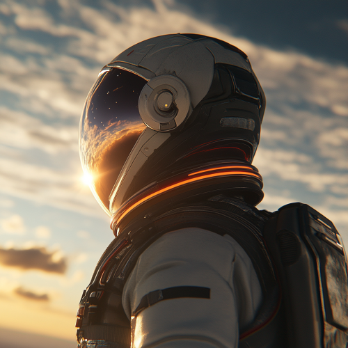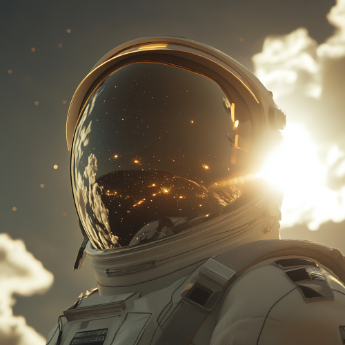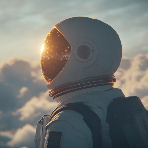 ide view shot of an astronaut in space, showing part of the helmet and shoulder. The visor reflects the bright sun, casting a glow across the helmet's face shield. Background features soft clouds fading into the vastness of space, with hints of stars peeking through. The scene has a realistic, high-detail style, capturing the sharp contrast between the bright sunlight and the dark, infinite space beyond. Photorealistic, high-resolution, cinematic lighting.